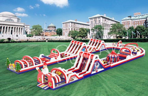 This newest Christmas themed inflatable obstacle course is U-shaped design, featured with a lot of Christmas elements, such as Santa Claus cartoon, jingle bell, Christmas tree, snow balls, etc. The obstacle challenges include pillars, tunnels, climbing walls, slides, ball pit, maze, carousel, wrecking balls, etc. Children must have a good time on the large inflatable obstacle course, especially in the Christmas holiday. Made of top quality 0.55mm PVC tarpaulin, mainly red and white colors, with customized Christmas printings.